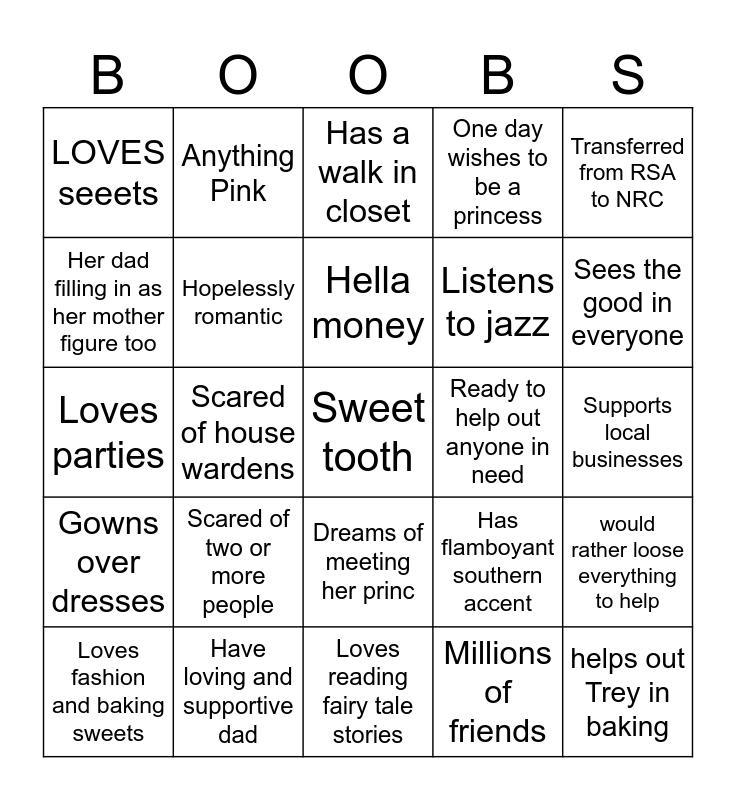 This bingo card has a free space and 24 words: Scared of two or more people, Have loving and supportive dad, Hella money, Loves fashion and baking sweets, Transferred from RSA to NRC, LOVES seeets, Her dad filling in as her mother figure too, Anything Pink, Ready to help out anyone in need, Dreams of meeting her princ, Listens to jazz, Loves parties, Has flamboyant southern accent, would rather loose everything to help, Hopelessly romantic, Millions of friends, Supports local businesses, Has a walk in closet, Sees the good in everyone, Scared of house wardens, helps out Trey in baking, Gowns over dresses, One day wishes to be a princess and Loves reading fairy tale stories.
