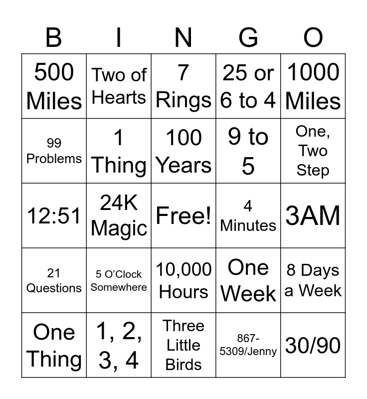 This bingo card has a free space and 40 words: 1985, 12:51, 22, 1 Thing, 1, 2, 3, 4, 10,000 Hours, 100 Years, 100 Years, 1000 Miles, 21 Questions, 24K Magic, 25 or 6 to 4, 30/90, 3AM, 4 Minutes, 5 O’Clock Somewhere, 50 Ways to Leave Your Lover, 500 Miles, 7 Nation Army, 7 Rings, 8 Days a Week, 867-5309/Jenny, 9 to 5, 99 Problems, A Thousand Years, If I Had $1,000,000, If You Had My Love (Remix 2), Million Reasons, One Call Away, One Less Lonely Girl, One More Time, One Thing, One Way or Another, One Week, One, Two Step, Three Little Birds, Three Times a Lady, Two Is Better Than One, Two of Hearts and Two Princes.