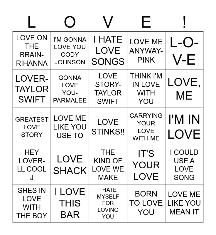 This bingo card has a free space and 24 words: LOVE SHACK, I LOVE THIS BAR, LOVE STORY-TAYLOR SWIFT, SHES IN LOVE WITH THE BOY, L-O-V-E, LOVE ON THE BRAIN-RIHANNA, LOVER-TAYLOR SWIFT, I'M GONNA LOVE YOU CODY JOHNSON, CARRYING YOUR LOVE WITH ME, THE KIND OF LOVE WE MAKE, THINK I'M IN LOVE WITH YOU, GREATEST LOVE STORY, IT'S YOUR LOVE, I COULD USE A LOVE SONG, GONNA LOVE YOU- PARMALEE, BORN TO LOVE YOU, I'M IN LOVE, I HATE LOVE SONGS, LOVE, ME, LOVE ME LIKE YOU USE TO, LOVE ME LIKE YOU MEAN IT, HEY LOVER-LL COOL J, LOVE ME ANYWAY- PINK and I HATE MYSELF FOR LOVING YOU.