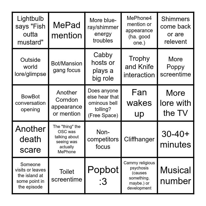 This bingo card has a free space and 24 words: The "thing" the OSC was talking about seeing was actually MePhone, Toilet screentime, Cabby hosts or plays a big role, Someone visits or leaves the island at some point in the episode, Shimmers come back or are relevent, Lightbulb says "Fish outta mustard", Outside world lore/glimpse, MePad mention, Fan wakes up, Non-competitors focus, Trophy and Knife interaction, BowBot conversation opening, Cliffhanger, 30-40+ minutes, Bot/Mansion gang focus, Cammy religious psychosis (causes something. maybe.) or development, More lore with the TV, More blue-ray/shimmer energy troubles, More Poppy screentime, Another Corndon appearance or mention, Musical number, Another death scare, MePhone4 mention or appearance (ha. good one.) and Popbot :3.