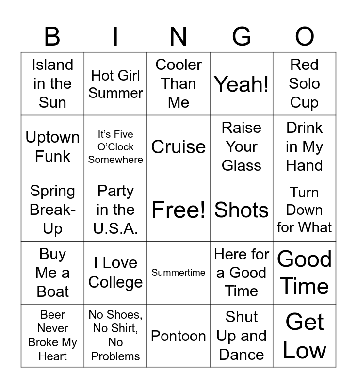 This bingo card has a free space and 40 words: Spring Break, Spring Break-Up, Toes, It’s Five O’Clock Somewhere, No Shoes, No Shirt, No Problems, Summertime, Cruise, Chicken Fried, Red Solo Cup, Buy Me a Boat, Party in the U.S.A., Yeah!, Get Low, Turn Down for What, Shots, I Love College, All Summer Long, Island in the Sun, Cake by the Ocean, Cooler Than Me, Good Time, Shut Up and Dance, Raise Your Glass, Uptown Funk, Can’t Stop the Feeling!, Fireball, Timber, Feel This Moment, Temperature, Cake, Wagon Wheel, Beer Never Broke My Heart, Drunk (And I Don’t Wanna Go Home), Here for a Good Time, Drink in My Hand, Pontoon, Watermelon Sugar, Sunroof, Hot Girl Summer and Party Rock Anthem.