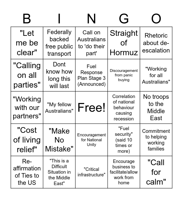 This bingo card has a free space and 24 words: "Make No Mistake", "This is a Difficult Situation in the Middle East", Fuel Response Plan Stage 3 (Announced), Re-affirmation of Ties to the US, Rhetoric about de-escalation, "Let me be clear", "Calling on all parties", Federally backed free public transport, Correlation of national behaviour causing recession, Encouragement for National Unity, Discouragement from panic buying, "Working with our partners", "Fuel security" (said 10 times or more), Commitment to helping working families, Dont know how long this will last, Encourage business to facilitate/allow work from home, No troops to the Middle East, Call on Australians to 'do their part', "Working for all Australians", "My fellow Australians", "Call for calm", "Cost of living relief", Straight of Hormuz and "Critical infrastructure".