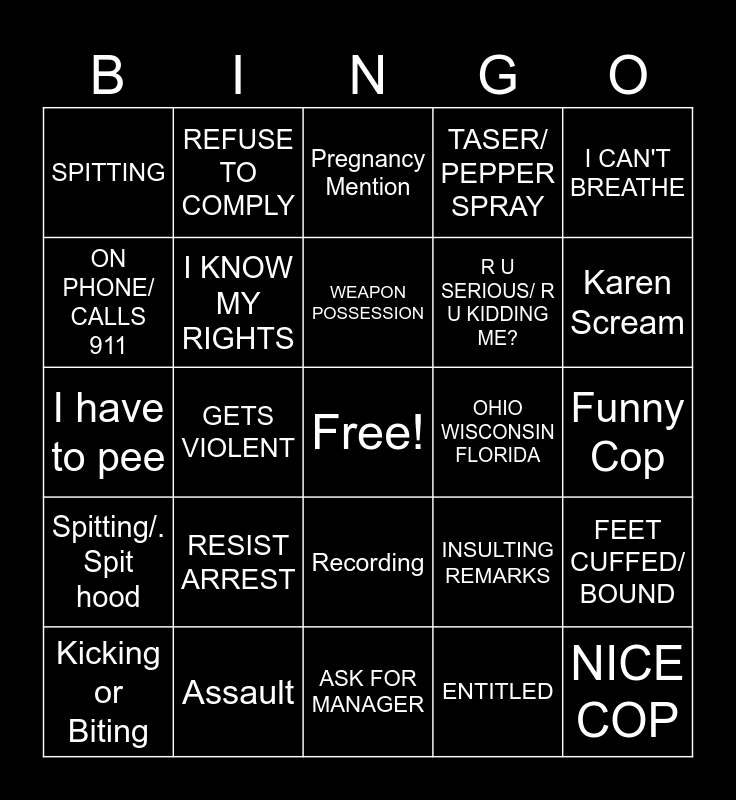 This bingo card has a free space and 49 words: TRESPASS, NICE COP, RACIAL REMARKS, ASK FOR MANAGER, RESIST ARREST, CURSING, REFUSE TO COMPLY, DO YOU KNOW WHO I AM, ON PHONE/ CALLS 911, CRYING/ BEGGING, I KNOW MY RIGHTS, TASER/ PEPPER SPRAY, FEET CUFFED/ BOUND, INSULTING REMARKS, HANDCUFF, FOR WHAT?!, WEAPON POSSESSION, OHIO WISCONSIN FLORIDA, I’ll Sue/ Lawyer, I CAN'T BREATHE, GETS VIOLENT, ENTITLED, SPITTING, R U SERIOUS/ R U KIDDING ME?, I didn’t do anything, Karen Scream, Kicking or Biting, Loosen Cuff, Recording, Spitting/. Spit hood, No nonsense Cop, Drug Possession, Drunk/ DUI, Coochie Karen, Assault, He/She Abused Me, Crazy Eyes, Pees, Funny Cop, Fleeing From Cops, I have to go XYZ, Mention Family Member, Knows Dying Person, Throwing Stuff, I have to pee, Pregnancy Mention, 2 Drinks, I’ve Done XYZ and Rage.
