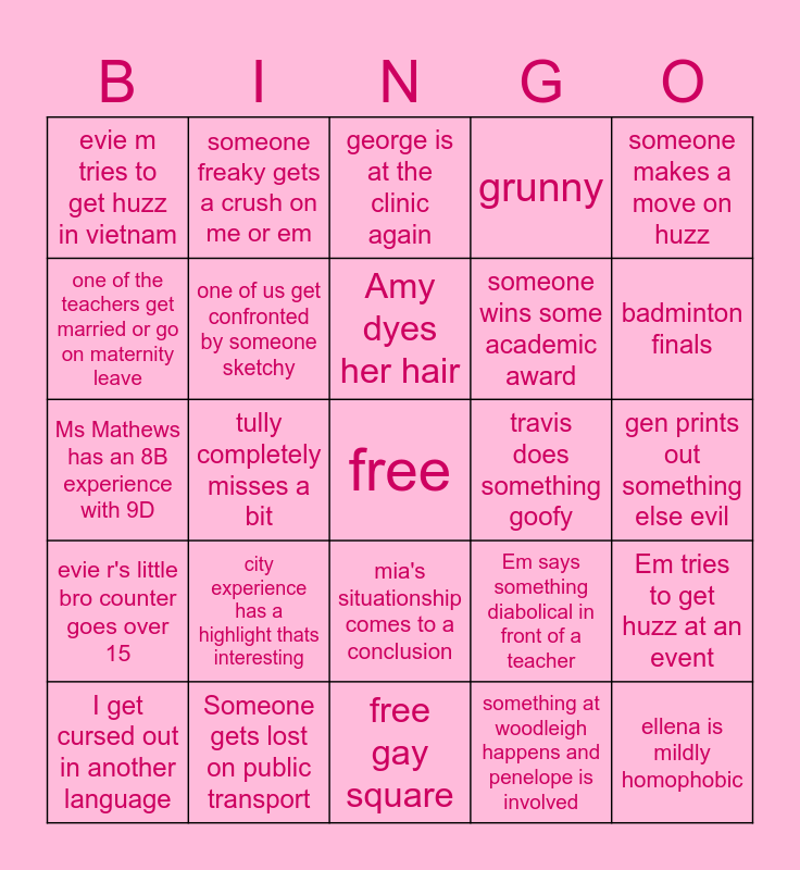 This bingo card has a free space and 24 words: city experience has a highlight thats interesting, Someone gets lost on public transport, Amy dyes her hair, I get cursed out in another language, someone makes a move on huzz, evie m tries to get huzz in vietnam, one of the teachers get married or go on maternity leave, someone freaky gets a crush on me or em, travis does something goofy, mia's situationship comes to a conclusion, someone wins some academic award, Ms Mathews has an 8B experience with 9D, Em says something diabolical in front of a teacher, Em tries to get huzz at an event, one of us get confronted by someone sketchy, something at woodleigh happens and penelope is involved, gen prints out something else evil, george is at the clinic again, badminton finals, tully completely misses a bit, ellena is mildly homophobic, evie r's little bro counter goes over 15, grunny and free gay square.