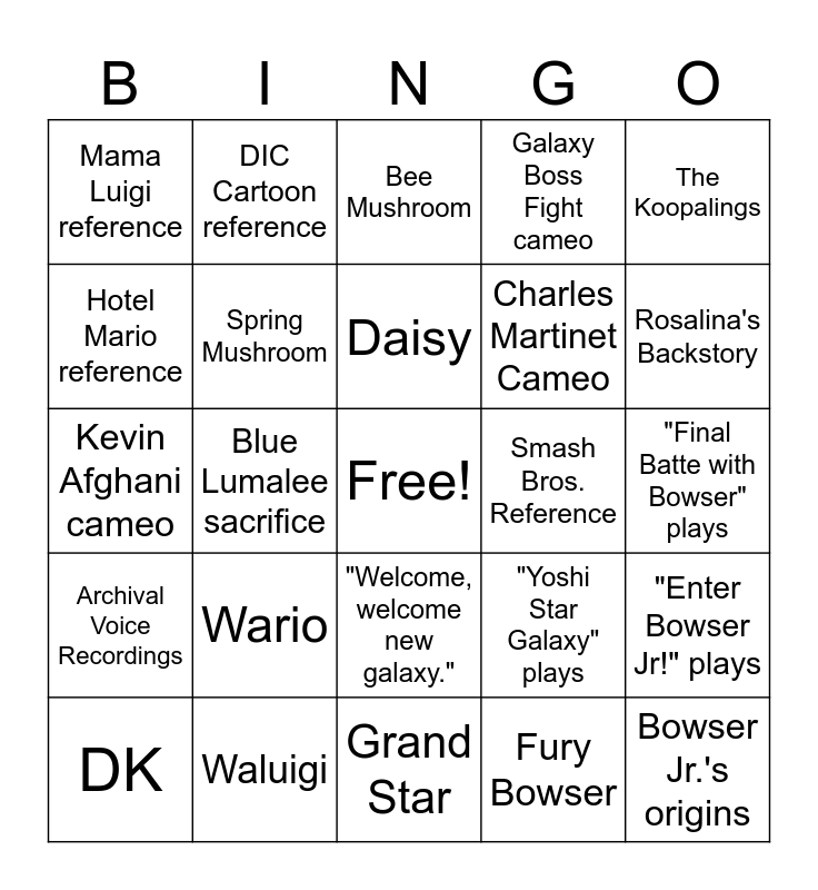 This bingo card has a free space and 24 words: Wario, Waluigi, Daisy, DK, The Koopalings, Mama Luigi reference, Hotel Mario reference, DIC Cartoon reference, Smash Bros. Reference, "Welcome, welcome new galaxy.", Charles Martinet Cameo, Kevin Afghani cameo, "Yoshi Star Galaxy" plays, "Enter Bowser Jr!" plays, Spring Mushroom, Fury Bowser, "Final Batte with Bowser" plays, Bee Mushroom, Rosalina's Backstory, Blue Lumalee sacrifice, Bowser Jr.'s origins, Archival Voice Recordings, Galaxy Boss Fight cameo and Grand Star.
