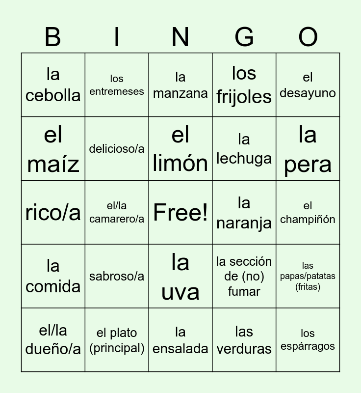 This bingo card has a free space and 33 words: el almuerzo, la banana, el/la camarero/a, la cena, la comida, delicioso/a, el desayuno, el/la dueño/a, los entremeses, las frutas, el limón, la manzana, el melocotón, el menú, la naranja, la pera, el plato (principal), rico/a, sabroso/a, la sección de (no) fumar, la uva, las arvejas, la cebolla, el champiñón, la ensalada, los espárragos, los frijoles, la lechuga, el maíz, las papas/patatas (fritas), el tomate, las verduras and la zanahoria.