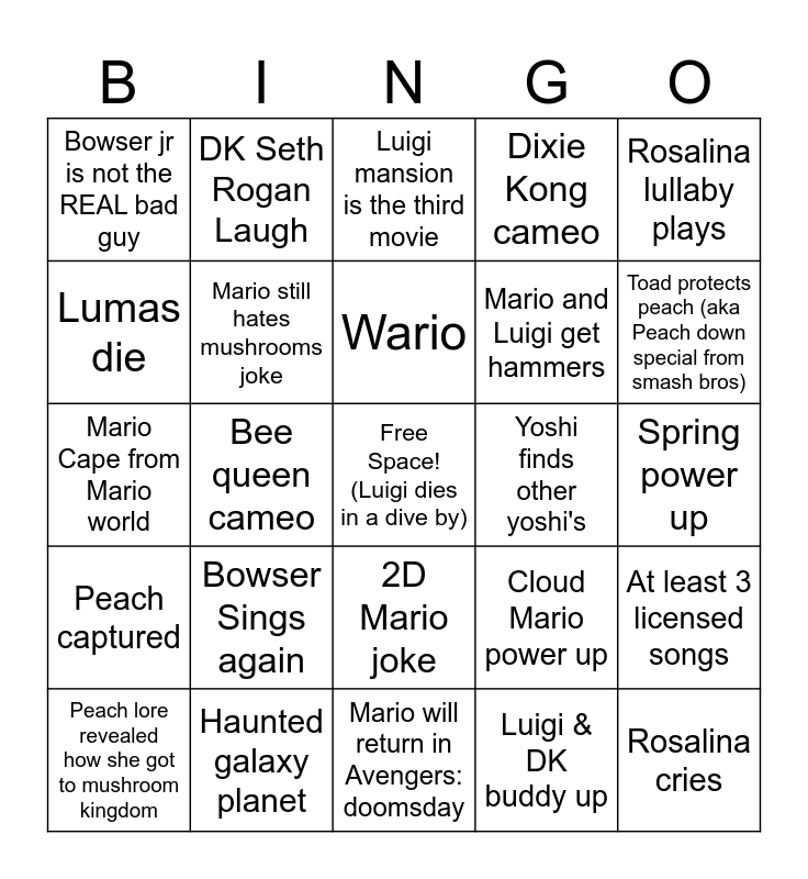 This bingo card has a free space and 24 words: Bowser Sings again, Haunted galaxy planet, Wario, Peach lore revealed how she got to mushroom kingdom, Rosalina lullaby plays, Bowser jr is not the REAL bad guy, Lumas die, DK Seth Rogan Laugh, Yoshi finds other yoshi's, 2D Mario joke, Mario and Luigi get hammers, Mario Cape from Mario world, Cloud Mario power up, At least 3 licensed songs, Mario still hates mushrooms joke, Luigi & DK buddy up, Spring power up, Luigi mansion is the third movie, Toad protects peach (aka Peach down special from smash bros), Bee queen cameo, Rosalina cries, Peach captured, Dixie Kong cameo and Mario will return in Avengers: doomsday.