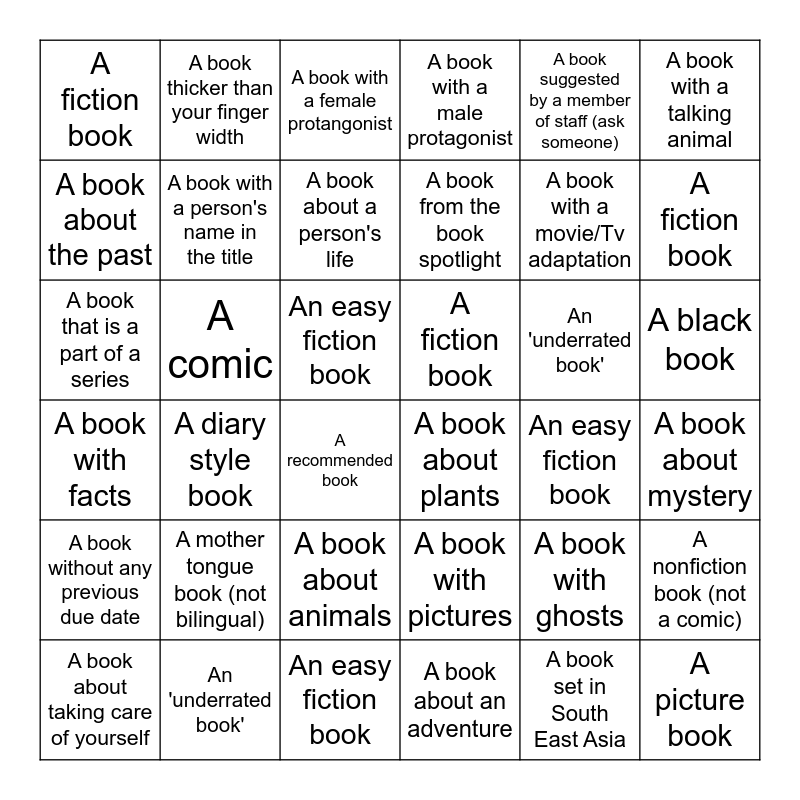 This bingo card has 36 words: A book with pictures, A book about animals, A book about an adventure, A book about the past, A book with facts, A fiction book, A book with a person's name in the title, An easy fiction book, A book suggested by a member of staff (ask someone), A book with ghosts, A fiction book, A book with a male protagonist, A nonfiction book (not a comic), A comic, A book from the book spotlight, A fiction book, A book without any previous due date, An 'underrated book', A book that is a part of a series, A book with a female protangonist, An easy fiction book, A diary style book, A book about plants, A recommended book, An easy fiction book, A book thicker than your finger width, A book with a movie/Tv adaptation, An 'underrated book', A book about a person's life, A book with a talking animal, A picture book, A book about taking care of yourself, A book about mystery, A black book, A mother tongue book (not bilingual) and A book set in South East Asia.