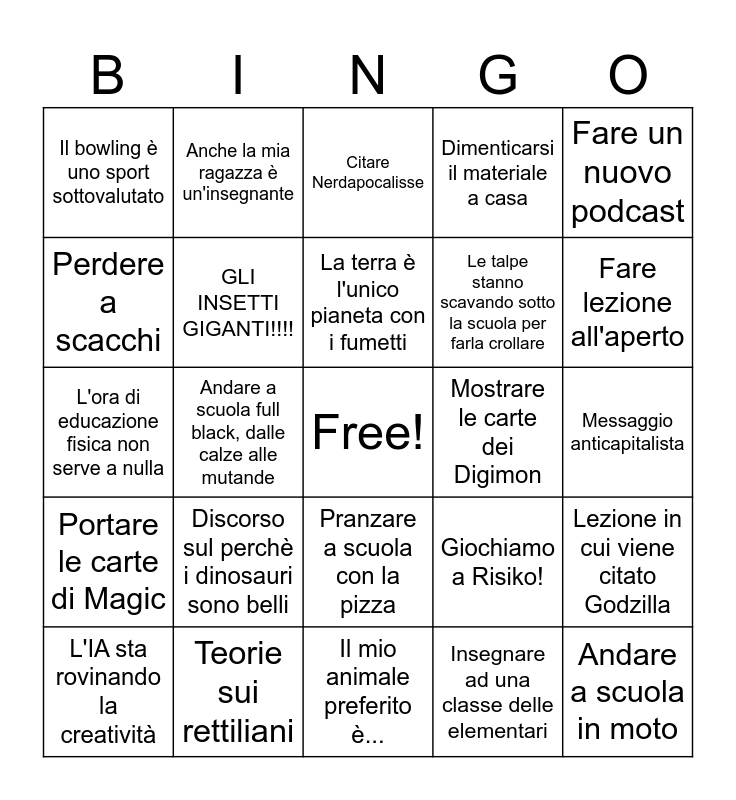 This bingo card has a free space and 24 words: Discorso sul perchè i dinosauri sono belli, Teorie sui rettiliani, La terra è l'unico pianeta con i fumetti, L'IA sta rovinando la creatività, Fare un nuovo podcast, Il bowling è uno sport sottovalutato, Perdere a scacchi, Anche la mia ragazza è un'insegnante, Mostrare le carte dei Digimon, Pranzare a scuola con la pizza, Le talpe stanno scavando sotto la scuola per farla crollare, L'ora di educazione fisica non serve a nulla, Giochiamo a Risiko!, Lezione in cui viene citato Godzilla, GLI INSETTI GIGANTI!!!!, Insegnare ad una classe delle elementari, Messaggio anticapitalista, Citare Nerdapocalisse, Fare lezione all'aperto, Andare a scuola full black, dalle calze alle mutande, Andare a scuola in moto, Portare le carte di Magic, Dimenticarsi il materiale a casa and Il mio animale preferito è....