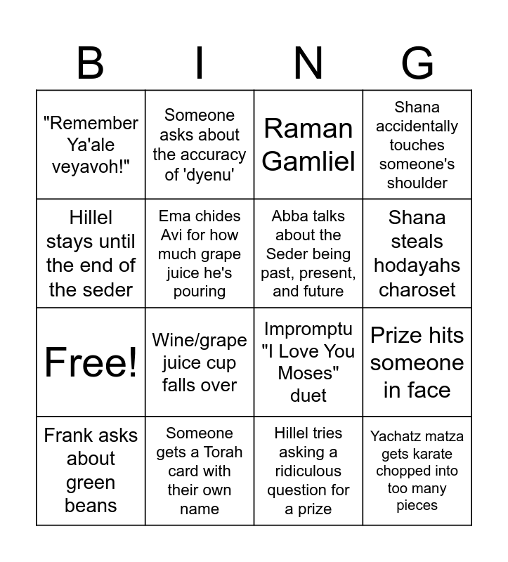 This bingo card has 20 words: Prize hits someone in face, Explanation of the things on the seder plate, Raman Gamliel, Matza ball soup, Frank asks about green beans, Hillel stays until the end of the seder, Someone gets a Torah card with their own name, "Remember Ya'ale veyavoh!", Free!, Someone asks about the accuracy of 'dyenu', Wine/grape juice cup falls over, Impromptu "I Love You Moses" duet, Ema chides Avi for how much grape juice he's pouring, Yachatz matza gets karate chopped into too many pieces, Abba talks about the Seder being past, present, and future, Hodayah says the carpas "tastes like pesach", Shana steals hodayahs charoset, Shana accidentally touches someone's shoulder, Hillel tries asking a ridiculous question for a prize and Abba begins answer to a question with "ah, very good".