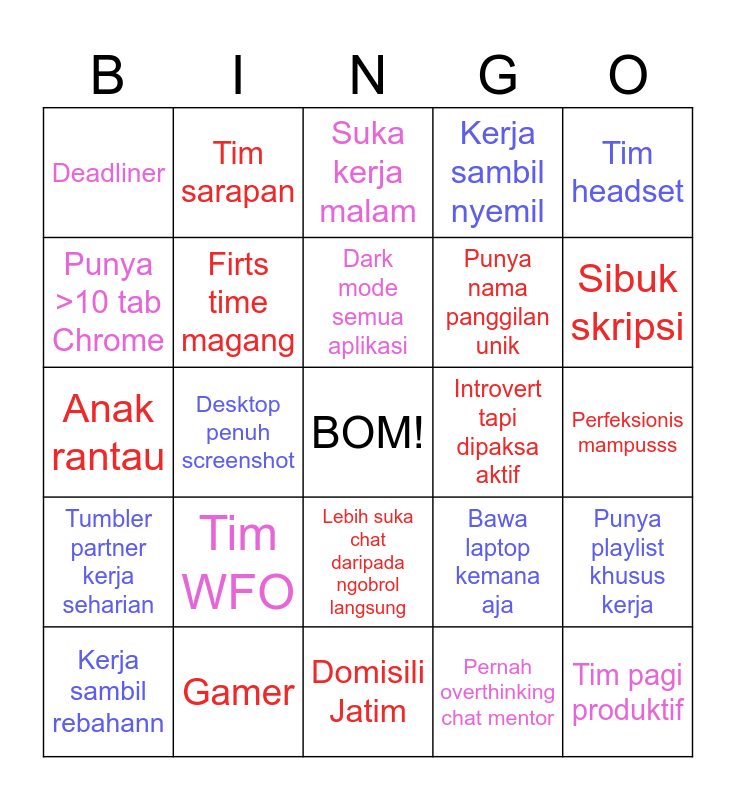 This bingo card has a free space and 24 words: Tim WFO, Gamer, Dark mode semua aplikasi, Kerja sambil rebahann, Tim headset, Deadliner, Punya >10 tab Chrome, Tim sarapan, Introvert tapi dipaksa aktif, Lebih suka chat daripada ngobrol langsung, Punya nama panggilan unik, Anak rantau, Bawa laptop kemana aja, Punya playlist khusus kerja, Firts time magang, Pernah overthinking chat mentor, Perfeksionis mampusss, Suka kerja malam, Sibuk skripsi, Desktop penuh screenshot, Tim pagi produktif, Tumbler partner kerja seharian, Kerja sambil nyemil and Domisili Jatim.