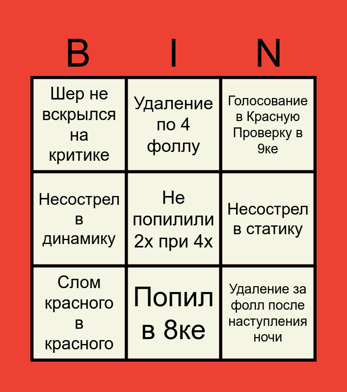 This bingo card has 9 words: Слом красного в красного, Голосование в Красную Проверку в 9ке, Удаление по 4 фоллу, Несострел в динамику, Шер не вскрылся на критике, Несострел в статику, Не попилили 2х при 4х, Удаление за фолл после наступления ночи and Попил в 8ке.