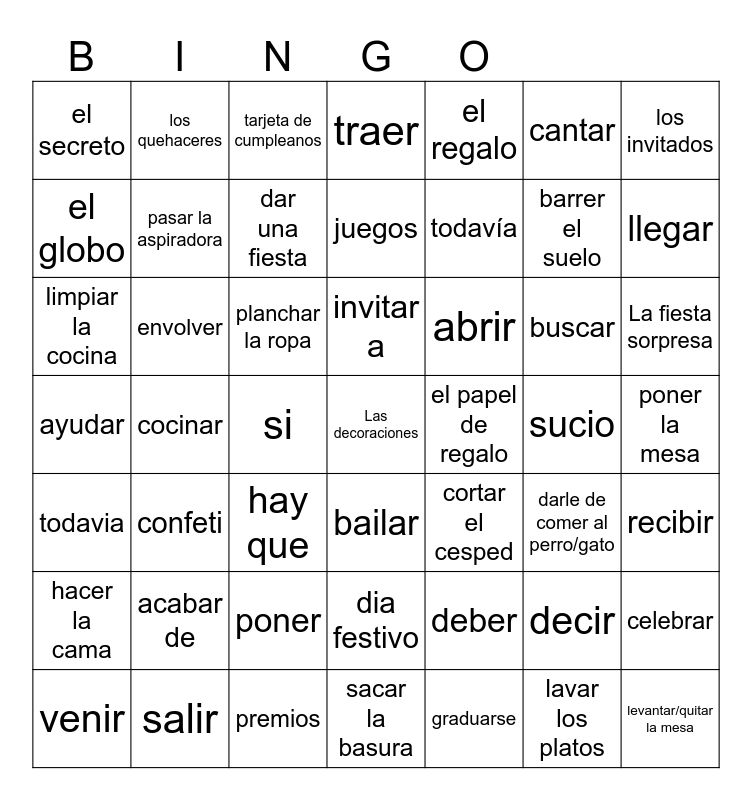 This bingo card has a free space and 48 words: deber, barrer el suelo, sacar la basura, cocinar, planchar la ropa, poner la mesa, los quehaceres, salir, cantar, bailar, los invitados, traer, buscar, abrir, hacer la cama, sucio, el globo, llegar, decir, el regalo, todavía, si, el secreto, pasar la aspiradora, celebrar, dar una fiesta, La fiesta sorpresa, venir, invitar a, envolver, lavar los platos, el papel de regalo, recibir, acabar de, ayudar, cortar el cesped, darle de comer al perro/gato, limpiar la cocina, hay que, poner, todavia, levantar/quitar la mesa, tarjeta de cumpleanos, premios, juegos, dia festivo, confeti and graduarse.