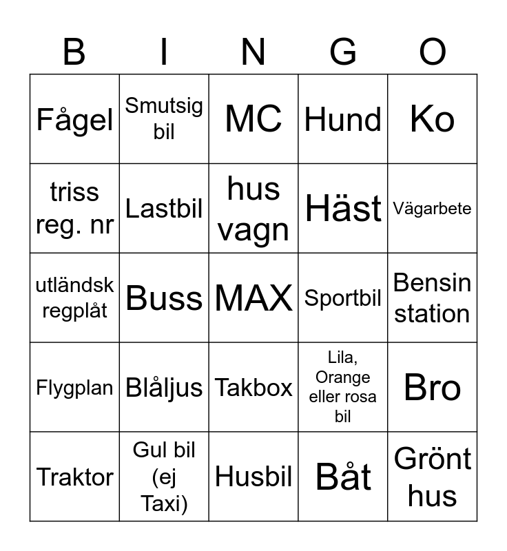 This bingo card has a free space and 24 words: Blåljus, Gul bil (ej Taxi), hus vagn, Traktor, Ko, Fågel, triss reg. nr, Smutsig bil, Sportbil, Takbox, Häst, utländsk regplåt, Lila, Orange eller rosa bil, Bro, Lastbil, Båt, Bensin station, MC, Vägarbete, Buss, Grönt hus, Flygplan, Hund and Husbil.