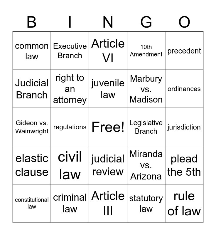 This bingo card has a free space and 24 words: civil law, criminal law, juvenile law, constitutional law, precedent, common law, Judicial Branch, Executive Branch, Legislative Branch, judicial review, Marbury vs. Madison, Gideon vs. Wainwright, Miranda vs. Arizona, plead the 5th, right to an attorney, statutory law, jurisdiction, Article VI, ordinances, regulations, rule of law, elastic clause, 10th Amendment and Article III.