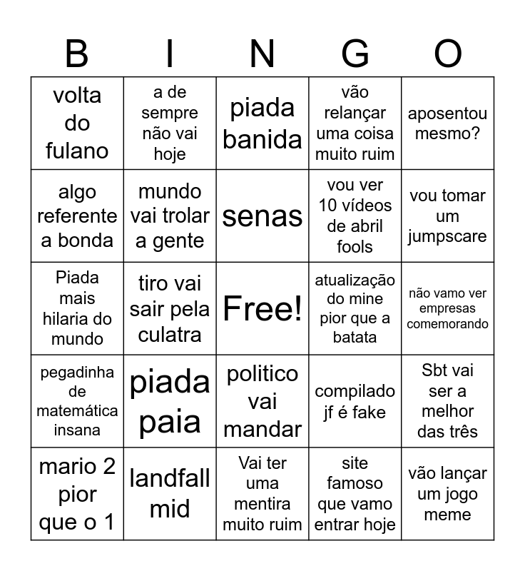 This bingo card has a free space and 24 words: piada paia, landfall mid, senas, mario 2 pior que o 1, aposentou mesmo?, volta do fulano, algo referente a bonda, a de sempre não vai hoje, atualização do mine pior que a batata, politico vai mandar, vou ver 10 vídeos de abril fools, Piada mais hilaria do mundo, compilado jf é fake, Sbt vai ser a melhor das três, mundo vai trolar a gente, site famoso que vamo entrar hoje, não vamo ver empresas comemorando, piada banida, vou tomar um jumpscare, tiro vai sair pela culatra, vão lançar um jogo meme, pegadinha de matemática insana, vão relançar uma coisa muito ruim and Vai ter uma mentira muito ruim.