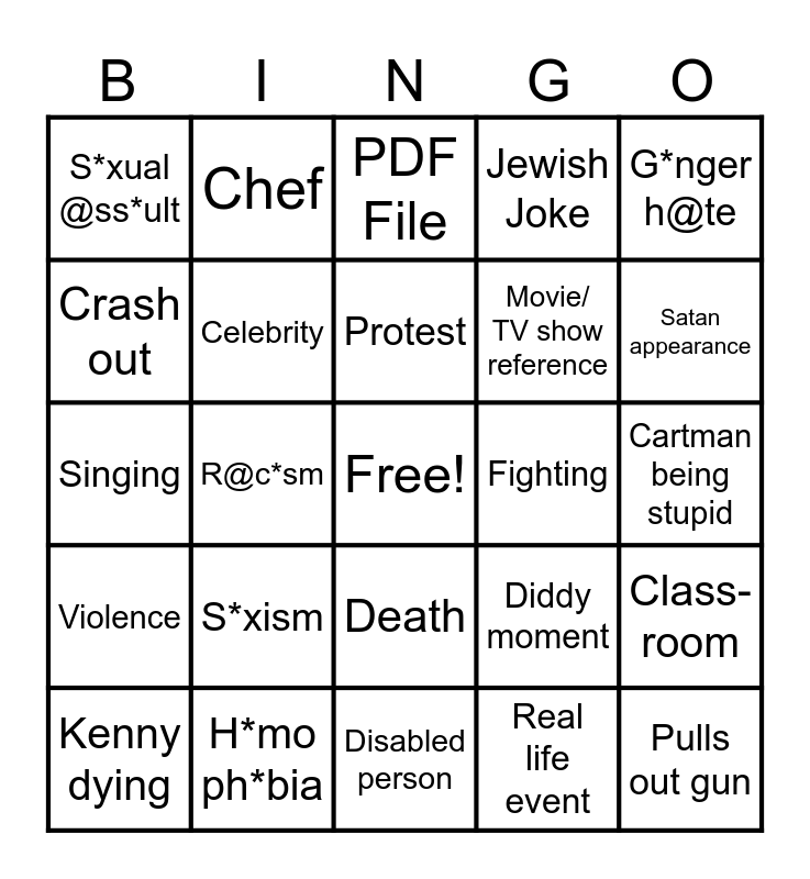 This bingo card has a free space and 29 words: Kenny dying, F@t joke, R@c*sm, Butters gets grounded, S*xual @ss*ult, PDF File, Celebrity, S*xism, Fighting, H*mo ph*bia, Cartman being stupid, Pulls out gun, Disabled person, Real life event, Satan appearance, Adults being stupid, Death, Violence, G*nger h@te, Singing, Diddy moment, 9/11 joke, Movie/ TV show reference, Crash out, Jewish Joke, Chef, Class-room, Protest and Prank.