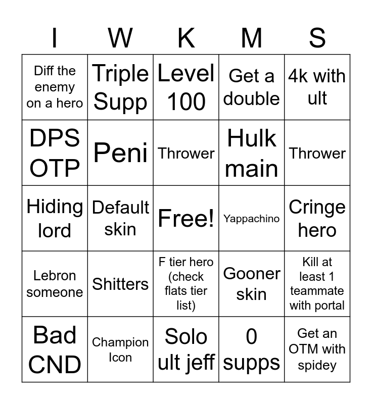 This bingo card has a free space and 24 words: Shitters, Champion Icon, Thrower, Bad CND, 4k with ult, Diff the enemy on a hero, DPS OTP, Triple Supp, Yappachino, F tier hero (check flats tier list), Hulk main, Hiding lord, Gooner skin, Kill at least 1 teammate with portal, Peni, 0 supps, Cringe hero, Level 100, Thrower, Default skin, Get an OTM with spidey, Lebron someone, Get a double and Solo ult jeff.