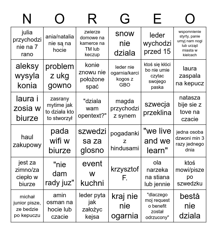 This bingo card has 39 words: amin osman na hocie lub czacie, michał junior pisze, ze bedzie po kepuczu, patrycja idzie na zakupy, aleksy wysyla konia, szwedzi sa za glosno, natasza bije sie z tove na czacie, problem z ukg gowno, bestå nie dziala, leder wychodzi przed 15, magda przychodzi z synem, laura zaspala na kepucz, snow nie dziala, laura i zosia w biurze, "dziala wam opentext?", zasrany mytime jak to działa kto to stworzył, szwecja przeklina, ola narzeka na stiana lub jennie, julia przychodzi nie na 7 rano, leder pyta jak założyc kejsa, haul zakupowy, wspomnienie styrty, panie umyj nam nogi lub urząd miasta w kielcach, "we live and we learn", konie znowu nie położone spać, leder nie ogarnia/karci kogos z GBO, kraj nie nie ogarnia, event w kuchni, jest za zimno/za ciepło w biurze, "dlaczego moj request o benefit został odrzucony", "nie dam rady juz", ania/natalia nie są na hocie, hotowicze, go której dziś, ktoś mowi/pisze po szwedzku, zwierze domowe na kamerce na TM lub keczup, pogadanki z hindusami, jedna osoba dzwoni min 3 razy jednego dnia, krzysztof F., pada wifi w biurze, ktoś się kłóci bo nie umie czytac swojego paska and nowa rzecz pojawia sie na szafce.