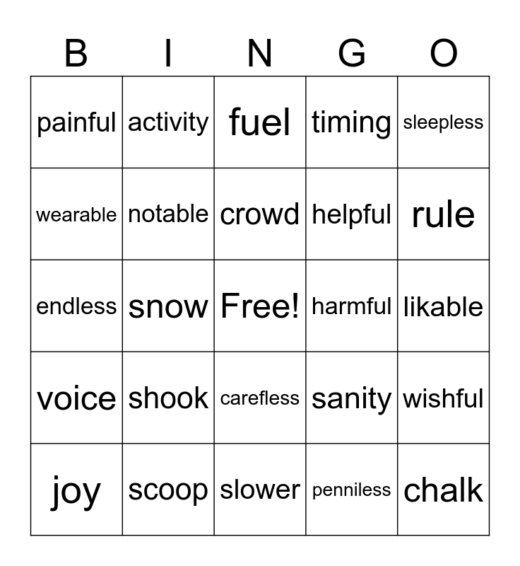 This bingo card has a free space and 24 words: shook, scoop, crowd, joy, sleepless, painful, wearable, activity, harmful, carefless, helpful, endless, sanity, wishful, notable, penniless, likable, fuel, rule, snow, chalk, voice, timing and slower.