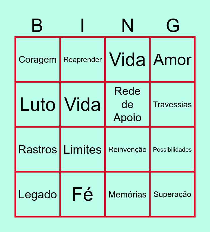 This bingo card has 35 words: Recomeços, Transformações, Presença, Rede de Apoio, Renascimento, Amor, Vida, Morte, Travessias, Esperança, Reinvenção, Luto, Tempo, Silêncio, Coragem, Fé, Caminhos, Possibilidades, Superação, Legado, Presença, Insistir, Resistir, Persistir, Vida, Limites, Ressurreições, Marcas, Rastros, Memórias, Pulsar, Resiliência, Movimento, Reaprender and Reinventar-se.