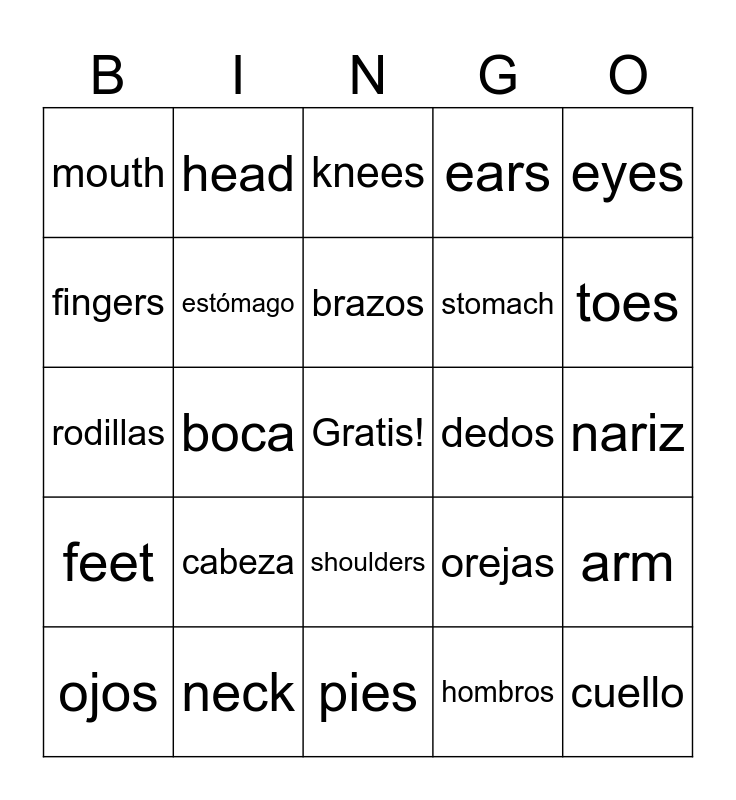 This bingo card has a free space and 24 words: cabeza, neck, brazos, ojos, eyes, mouth, fingers, head, dedos, shoulders, stomach, rodillas, orejas, arm, estómago, hombros, nariz, knees, toes, boca, cuello, feet, ears and pies.