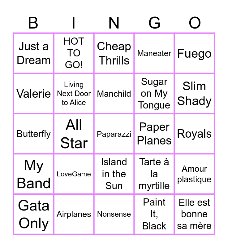 This bingo card has 25 words: LoveGame, Nonsense, Manchild, Gata Only, Fuego, Just a Dream, Valerie, HOT TO GO!, Paper Planes, Island in the Sun, Sugar on My Tongue, Butterfly, Tarte à la myrtille, Amour plastique, Living Next Door to Alice, Elle est bonne sa mère, Royals, Cheap Thrills, Slim Shady, All Star, Paparazzi, Airplanes, My Band, Maneater and Paint It, Black.