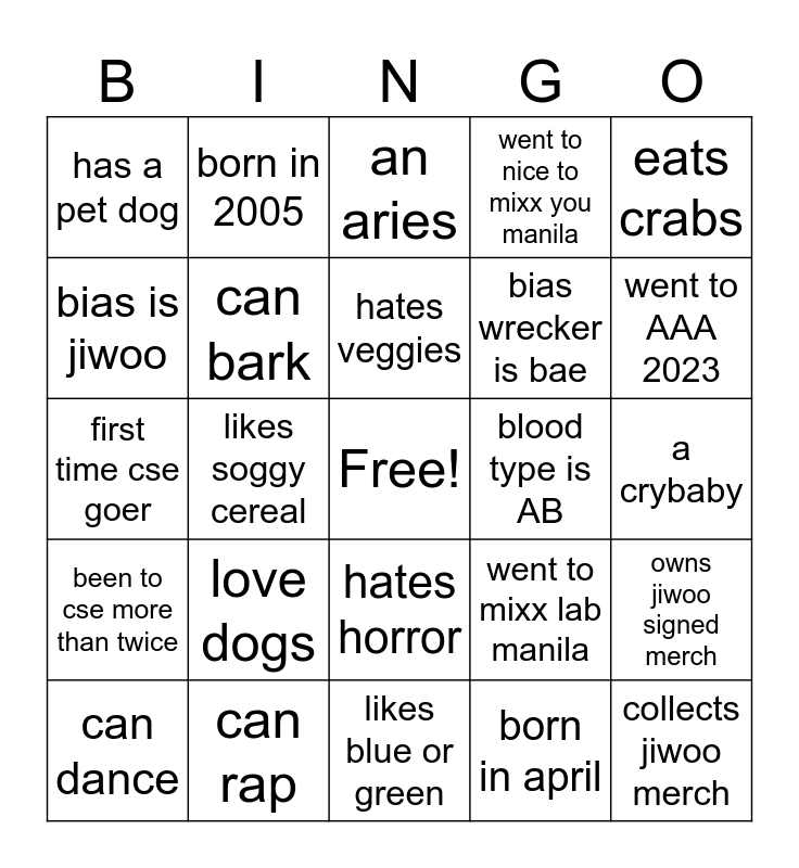 This bingo card has a free space and 24 words: can dance, love dogs, hates veggies, born in april, eats crabs, has a pet dog, born in 2005, an aries, blood type is AB, a crybaby, first time cse goer, can bark, went to mixx lab manila, owns jiwoo signed merch, bias is jiwoo, can rap, likes blue or green, went to nice to mixx you manila, went to AAA 2023, been to cse more than twice, likes soggy cereal, hates horror, bias wrecker is bae and collects jiwoo merch.