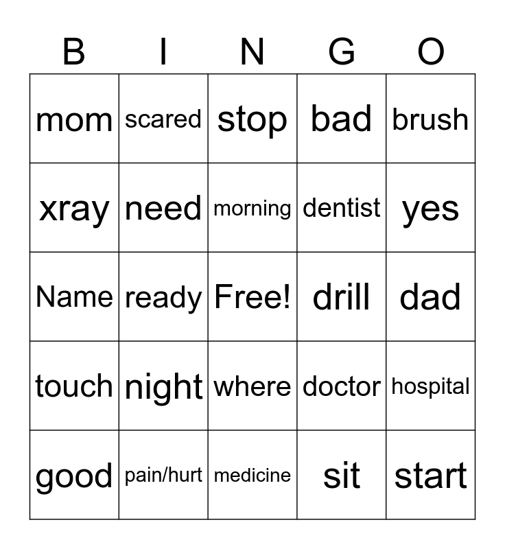 This bingo card has a free space and 27 words: doctor, nurse, dentist, medicine, xray, stop, scared, touch, drill, hospital, Name, bad, good, pain/hurt, yes, no, need, morning, night, mom, dad, sit, ready, start, where, brush and bite.