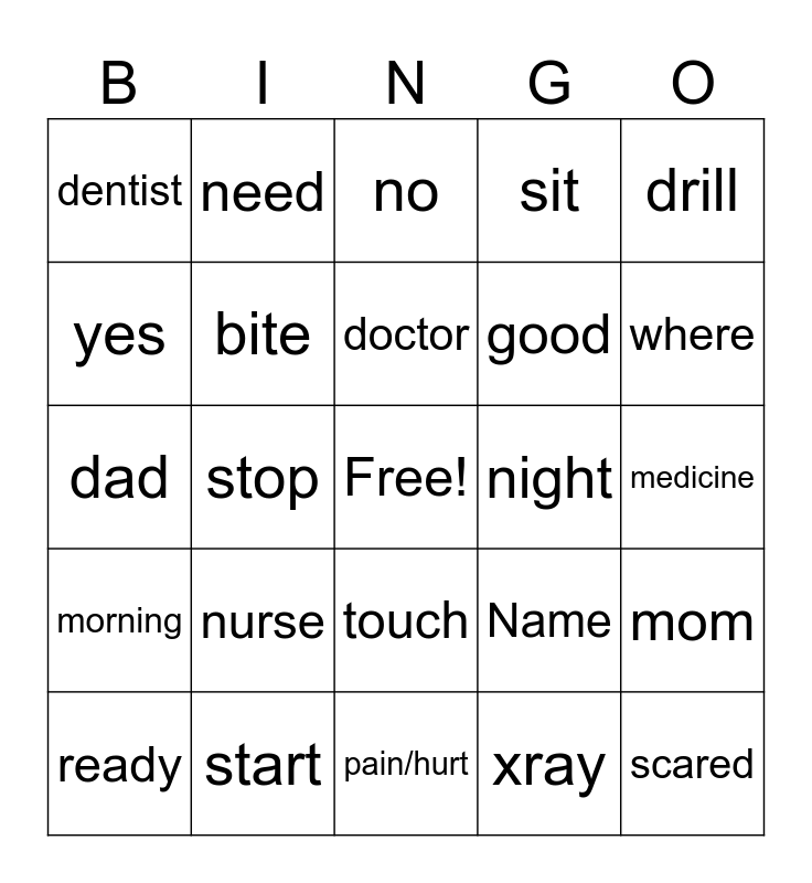 This bingo card has a free space and 27 words: Name, bad, good, pain/hurt, yes, no, need, morning, night, mom, dad, sit, ready, start, where, brush, bite, doctor, nurse, dentist, medicine, xray, stop, scared, touch, drill and hospital.