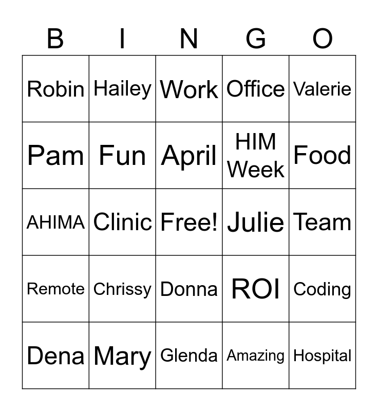 This bingo card has a free space and 24 words: Chrissy, Mary, April, Dena, Valerie, Robin, Pam, Hailey, Julie, Donna, HIM Week, AHIMA, ROI, Coding, Fun, Amazing, Team, Work, Food, Clinic, Hospital, Remote, Office and Glenda.
