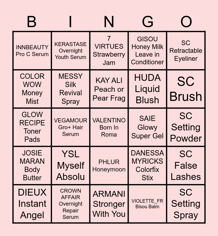 This bingo card has 30 words: DIEUX Instant Angel, K18 Molecular repair mask, KAY ALI Peach or Pear Frag, PATRICK TA Blush Duo, SC Retractable Eyeliner, INNBEAUTY Pro C Serum, KERASTASE Overnight Youth Serum, PHLUR Honeymoon, SAIE Glowy Super Gel, SC Setting Spray, JOSIE MARAN Body Butter, MESSY Silk Revival Spray, PRADA Paradigme, VIOLETTE_FR Bisou Balm, SC False Lashes, BEAUTY OF JOSEN Sunscreen, VEGAMOUR Gro+ Hair Serum, VALENTINO Born In Roma, DANESSA MYRICKS Colorfix Stix, SC Brush, GLOW RECIPE Toner Pads, CROWN AFFAIR Overnight Repair Serum, 7 VIRTUES Strawberry Jam, HUDA Liquid Blush, SC Setting Powder, COLOR WOW Money Mist, YSL Myself Absolu, ARMANI Stronger With You, GISOU Honey Milk Leave in Conditioner and HANYUL Yuja Sleeping Mask.