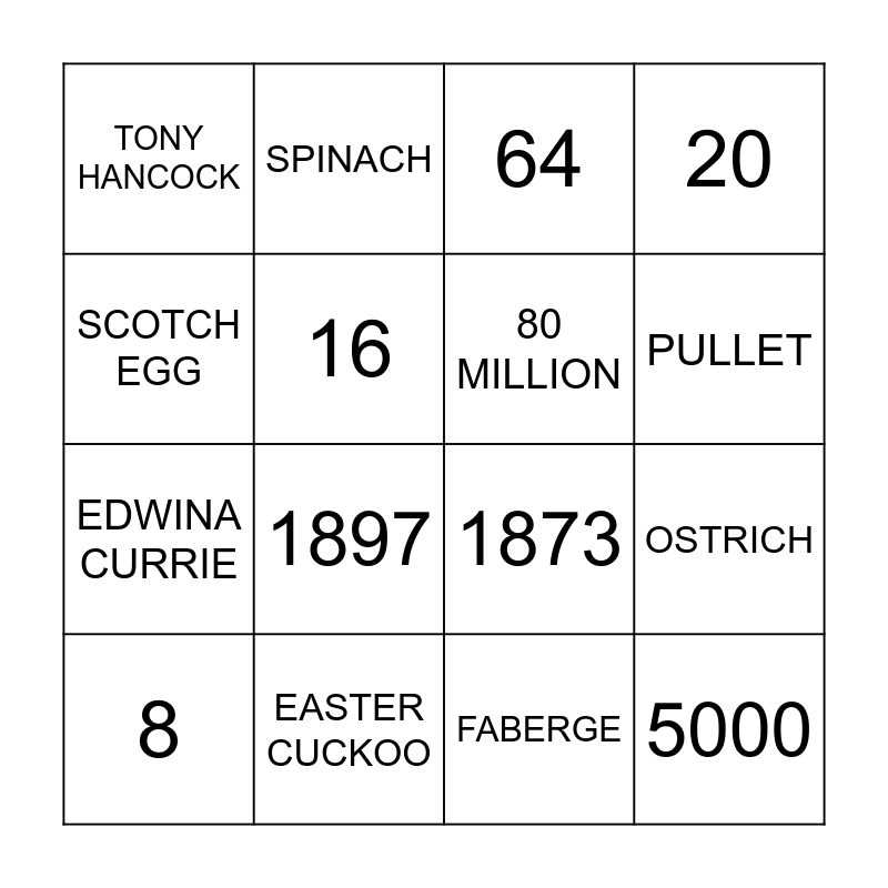 This bingo card has 19 words: 1873, FRYS, 64, 5000, OSTRICH, SCOTCH EGG, FABERGE, TONY HANCOCK, SPINACH, EDWINA CURRIE, 1897, 16, 80 MILLION, EASTER CUCKOO, 8, 25 BILLION, 20, PULLET and 371.