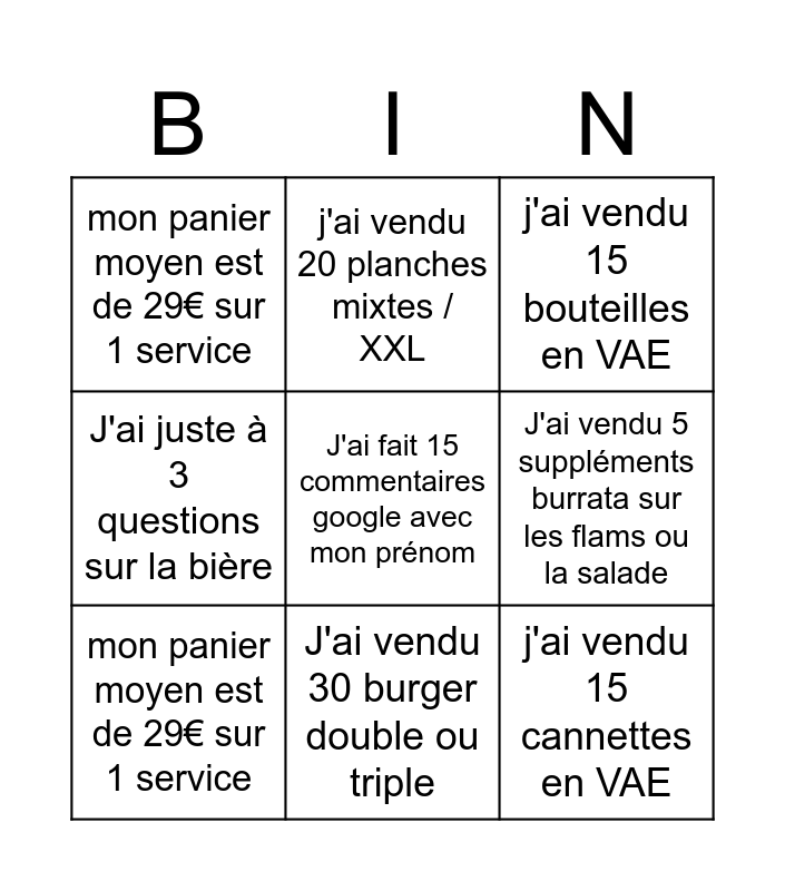 This bingo card has a free space and 8 words: J'ai vendu 5 suppléments burrata sur les flams ou la salade, j'ai vendu 15 bouteilles en VAE, j'ai vendu 20 planches mixtes / XXL, mon panier moyen est de 29€ sur 1 service, mon panier moyen est de 29€ sur 1 service, j'ai vendu 15 cannettes en VAE, J'ai juste à 3 questions sur la bière and J'ai vendu 30 burger double ou triple.