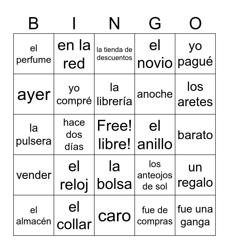 This bingo card has a free space and 34 words: fui de compras, fue de compras, las joyas, pagar, vender, yo compré, yo pagué, el almacén, en la red, la joyería, la librería, la tienda de descuentos, la tienda de segunda mano, la zapatería, el anillo, los aretes, el collar, la pulsera, el reloj, los anteojos de sol, la bolsa, la cartera, el perfume, barato, caro, fue una ganga, el novio, la novia, anoche, ayer, el año pasado, hace dos días, un regalo and mirar.