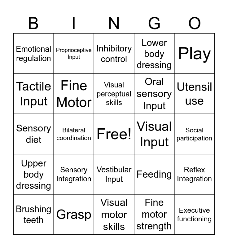 This bingo card has a free space and 24 words: Sensory Integration, Grasp, Visual perceptual skills, Brushing teeth, Play, Emotional regulation, Tactile Input, Proprioceptive Input, Visual Input, Vestibular Input, Oral sensory Input, Sensory diet, Feeding, Reflex Integration, Fine Motor, Fine motor strength, Social participation, Inhibitory control, Utensil use, Bilateral coordination, Executive functioning, Upper body dressing, Lower body dressing and Visual motor skills.