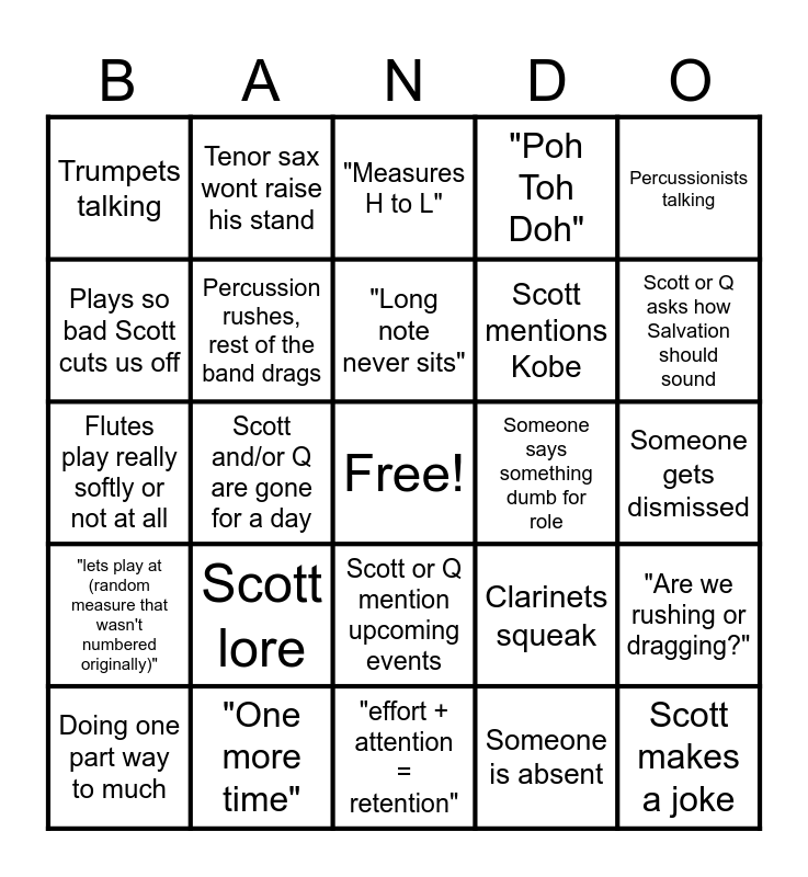 This bingo card has a free space and 24 words: Scott lore, "One more time", "Long note never sits", Doing one part way to much, Percussionists talking, Trumpets talking, Plays so bad Scott cuts us off, Tenor sax wont raise his stand, Someone says something dumb for role, Scott or Q mention upcoming events, Scott mentions Kobe, Flutes play really softly or not at all, Clarinets squeak, "Are we rushing or dragging?", Percussion rushes, rest of the band drags, Someone is absent, Someone gets dismissed, "Measures H to L", Scott or Q asks how Salvation should sound, Scott and/or Q are gone for a day, Scott makes a joke, "lets play at (random measure that wasn't numbered originally)", "Poh Toh Doh" and "effort + attention = retention".