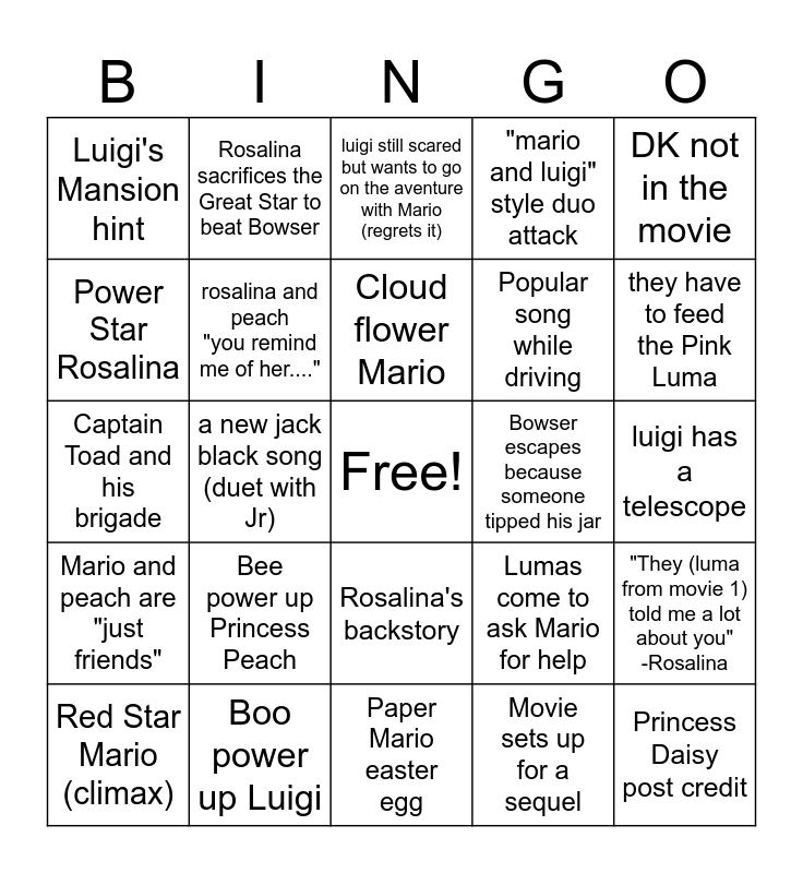 This bingo card has a free space and 24 words: Bee power up Princess Peach, Boo power up Luigi, Cloud flower Mario, Red Star Mario (climax), DK not in the movie, Luigi's Mansion hint, Power Star Rosalina, Rosalina sacrifices the Great Star to beat Bowser, Bowser escapes because someone tipped his jar, Rosalina's backstory, Popular song while driving, Captain Toad and his brigade, Lumas come to ask Mario for help, "They (luma from movie 1) told me a lot about you" -Rosalina, rosalina and peach "you remind me of her....", Movie sets up for a sequel, luigi has a telescope, luigi still scared but wants to go on the aventure with Mario (regrets it), they have to feed the Pink Luma, a new jack black song (duet with Jr), Princess Daisy post credit, Mario and peach are "just friends", "mario and luigi" style duo attack and Paper Mario easter egg.