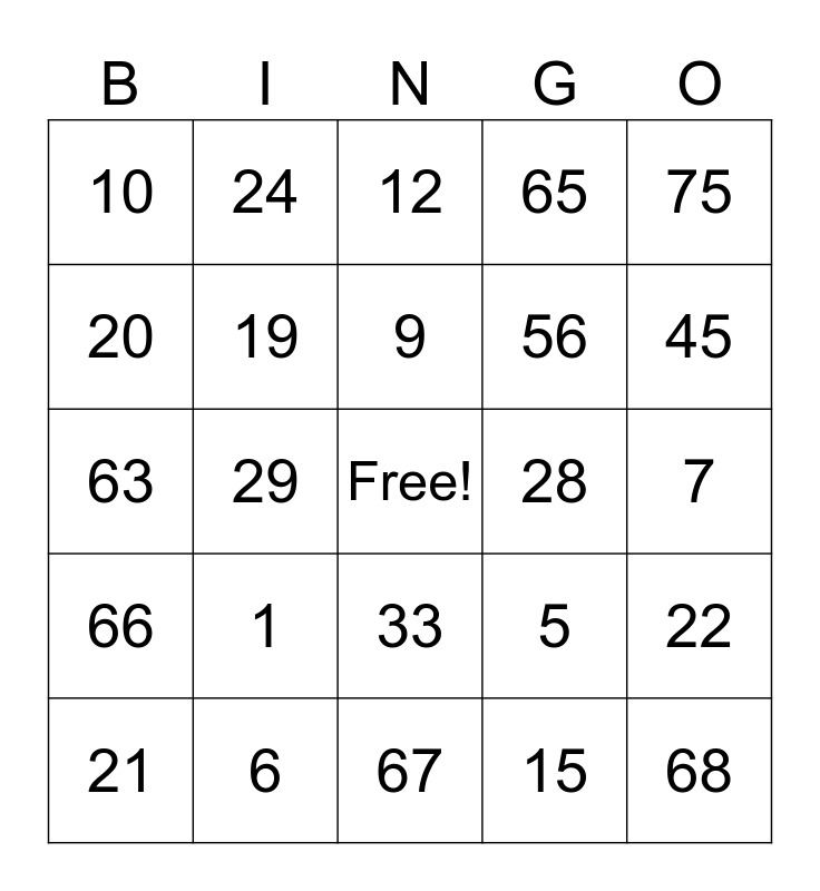 This bingo card has a free space and 24 words: 1, 6, 9, 21, 75, 10, 20, 24, 28, 33, 56, 63, 5, 22, 19, 15, 7, 12, 45, 29, 68, 66, 65 and 67.