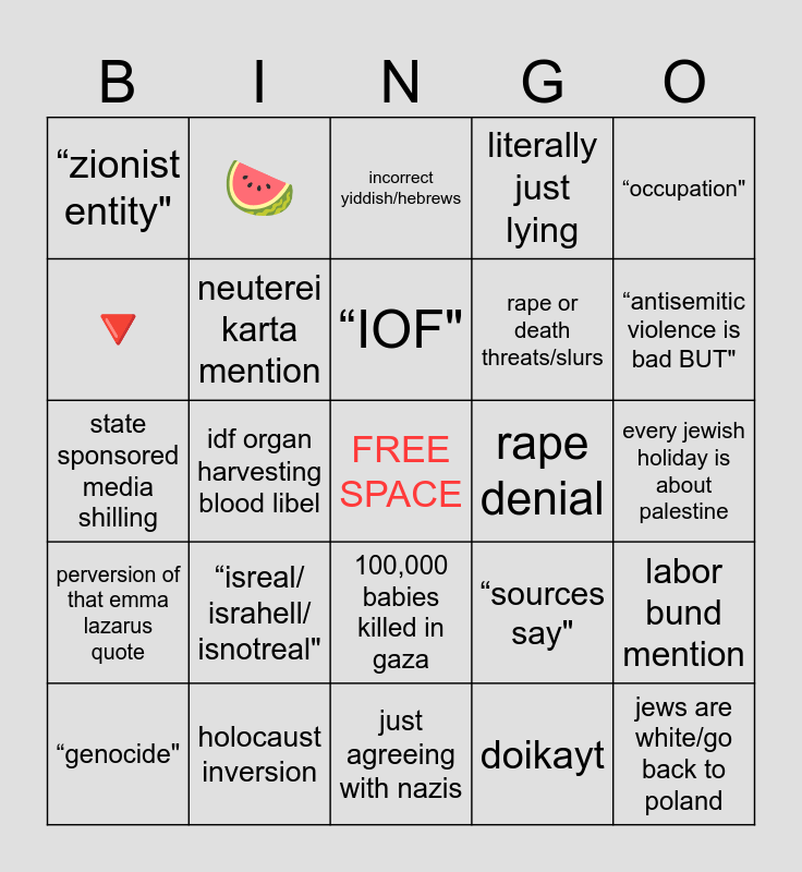 This bingo card has a free space and 24 words: “isreal/ israhell/ isnotreal", holocaust inversion, “IOF", “genocide", “occupation", “zionist entity", 🔻, 🍉, rape denial, 100,000 babies killed in gaza, rape or death threats/slurs, state sponsored media shilling, “sources say", labor bund mention, neuterei karta mention, doikayt, every jewish holiday is about palestine, incorrect yiddish/hebrews, “antisemitic violence is bad BUT", idf organ harvesting blood libel, jews are white/go back to poland, perversion of that emma lazarus quote, literally just lying and just agreeing with nazis.
