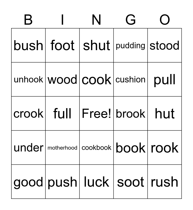 This bingo card has a free space and 24 words: motherhood, push, cook, good, stood, bush, unhook, foot, brook, cookbook, cushion, crook, book, rook, wood, soot, hut, shut, pull, full, rush, under, pudding and luck.