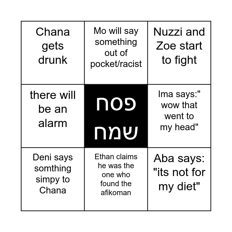 This bingo card has a free space and 10 words: Ethan claims he was the one who found the afikoman, Nuzzi and Zoe start to fight, Chana gets drunk, Aba says: "its not for my diet", there will be an alarm, Deni says somthing simpy to Chana, Mo will say something out of pocket/racist, Zoe complains that something is too spicy, Ima says:" wow that went to my head" and Nuzzi burps in the middle of the meal.