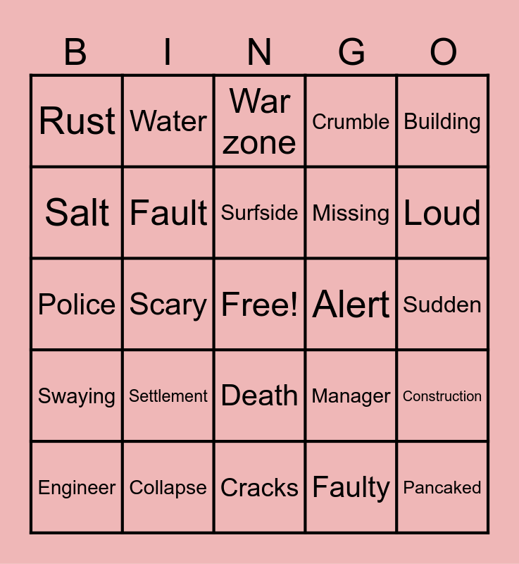This bingo card has a free space and 24 words: Settlement, Collapse, Surfside, Engineer, Building, Rust, Salt, Water, Alert, Death, Missing, Police, Manager, Construction, Fault, Faulty, Sudden, War zone, Loud, Scary, Pancaked, Swaying, Crumble and Cracks.