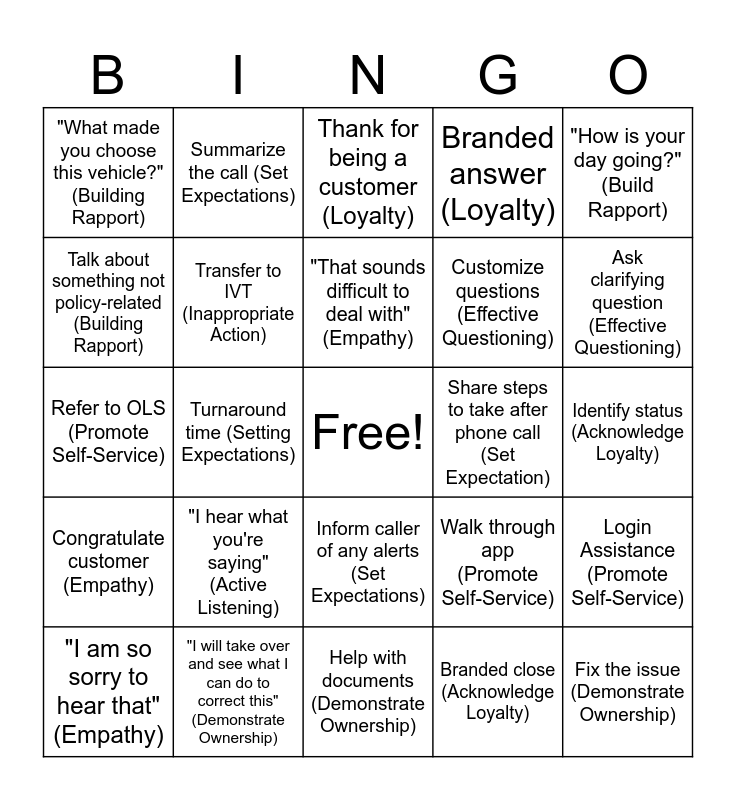 This bingo card has a free space and 24 words: "I hear what you're saying" (Active Listening), "I will take over and see what I can do to correct this" (Demonstrate Ownership), "That sounds difficult to deal with" (Empathy), "I am so sorry to hear that" (Empathy), "How is your day going?" (Build Rapport), "What made you choose this vehicle?" (Building Rapport), Talk about something not policy-related (Building Rapport), Summarize the call (Set Expectations), Share steps to take after phone call (Set Expectation), Inform caller of any alerts (Set Expectations), Customize questions (Effective Questioning), Refer to OLS (Promote Self-Service), Walk through app (Promote Self-Service), Login Assistance (Promote Self-Service), Transfer to IVT (Inappropriate Action), Branded close (Acknowledge Loyalty), Identify status (Acknowledge Loyalty), Thank for being a customer (Loyalty), Ask clarifying question (Effective Questioning), Turnaround time (Setting Expectations), Fix the issue (Demonstrate Ownership), Congratulate customer (Empathy), Branded answer (Loyalty) and Help with documents (Demonstrate Ownership).