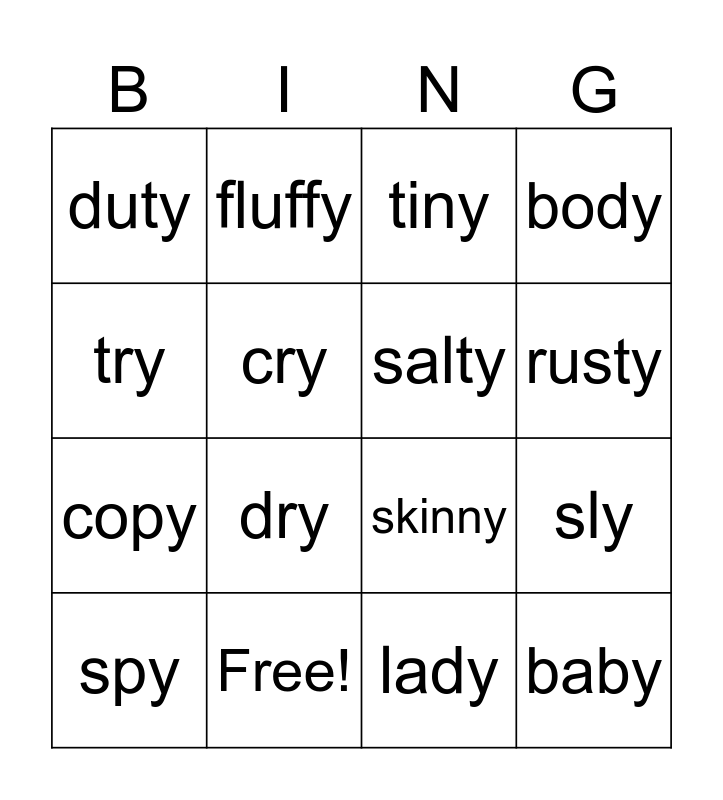 This bingo card has 21 words: Free!, dusty, fluffy, hungry, lady, salty, duty, tiny, skinny, rusty, copy, body, baby, flying, cry, pry, spy, dry, try, sly and crying.