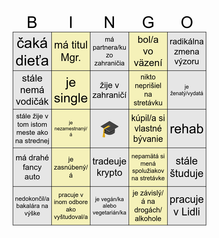 This bingo card has a free space and 24 words: nedokončil/a bakalára na výške, je zasnúbený/á, žije v zahraničí, je závislý/á na drogách/ alkohole, radikálna zmena výzoru, čaká dieťa, má titul Mgr., má partnera/ku zo zahraničia, kúpil/a si vlastné bývanie, rehab, stále žije v tom istom meste ako na strednej, je single, nepamätá si mená spolužiakov na stretávke, stále študuje, stále nemá vodičák, pracuje v inom odbore ako vyštudoval/a, je vegán/ka alebo vegetarián/ka, bol/a vo väzení, je ženatý/vydatá, má drahé fancy auto, je nezamestnaný/á, tradeuje krypto, nikto neprišiel na stretávku and pracuje v Lidli.