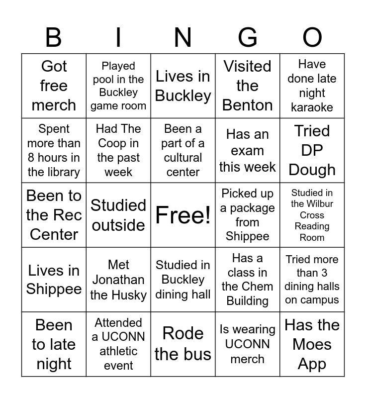 This bingo card has a free space and 24 words: Met Jonathan the Husky, Attended a UCONN athletic event, Been a part of a cultural center, Been to late night, Have done late night karaoke, Got free merch, Spent more than 8 hours in the library, Played pool in the Buckley game room, Picked up a package from Shippee, Studied in Buckley dining hall, Has an exam this week, Been to the Rec Center, Has a class in the Chem Building, Tried more than 3 dining halls on campus, Had The Coop in the past week, Is wearing UCONN merch, Studied in the Wilbur Cross Reading Room, Lives in Buckley, Tried DP Dough, Studied outside, Has the Moes App, Lives in Shippee, Visited the Benton and Rode the bus.