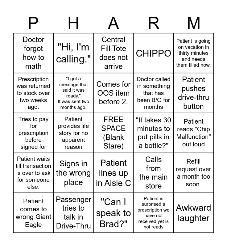This bingo card has a free space and 49 words: "I got a message that said it was ready. I deleted it.", Awkward laughter, Patient repeats the entire DOB when asked for just part of it., "Can I speak to Brad?", Signs in the wrong place, Doesn't hit Done, "Hi, I'm calling.", Patient wants to forge a signature., Prescription was returned to stock over two weeks ago., "I got a message that said it was ready." It doesn't say that., "I got a message that said it was ready." It was sent two months ago., CHIPPO, Refill request over a month too soon., Calls from the main store, once, Comes for CF item before 12., Comes for OOS item before 2., "It takes 30 minutes to put pills in a bottle?", Only signs once even though you explained what both signatures are for., Patient is going on vacation in thirty minutes and needs them filled now., Patient provides life story for no apparent reason, Patient is surprised a prescription we have not received yet is not ready, Doctor forgot how to math, Doctor called in something that has been B/O for months, Stupid answer to "What time do you want it ready?", Patient pushes drive-thru button, Patient comes to wrong Giant Eagle, Credit card inserted before transaction is started, Patient lines up in Aisle C, Patient waits till transaction is over to ask for someone else., 5 or more cars in drive-thru, Patient thinks only their last name is sufficient identification, Patient misgenders Peri despite obvious signs, Patient can't figure out how to go to the register to pick up, Passenger tries to talk in Drive-Thru, Patient won't stop talking while you're trying to do something for them, Patient just lies, Patient wanders off after filling out shot form, Patient reads "Chip Malfunction" out loud, Doctor sends in nonsense, Patient uses "I don't come here often" as an excuse for failing to follow basic instructions, Patient asks if something is ready immediately after being told that it is ready, Patient does not understand what "over the counter" means, Forgets family member's birthday, Tries to pay for prescription before signed for, Central Fill Tote does not arrive, "I left the doctor's office 20 minutes ago- is it ready?", "Is Goodrx A better Price?" and Sheetz Card.