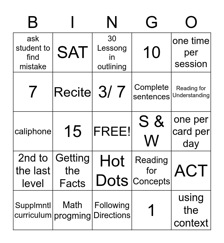 This bingo card has a free space and 24 words: Getting the Facts, Math progming, 3/ 7, Supplmntl curriculum, one time per session, ask student to find mistake, 7, SAT, S & W, Hot Dots, Complete sentences, caliphone, Reading for Concepts, ACT, Recite, 1, one per card per day, 30 Lessong in outlining, Reading for Understanding, 15, using the context, 2nd to the last level, 10 and Following Directions.
