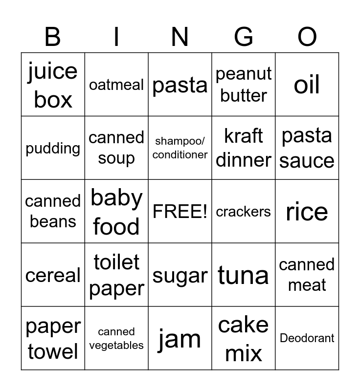 This bingo card has a free space and 24 words: toilet paper, canned vegetables, shampoo/ conditioner, paper towel, oil, juice box, pudding, oatmeal, crackers, sugar, kraft dinner, canned beans, tuna, canned meat, canned soup, cake mix, rice, pasta, pasta sauce, baby food, Deodorant, cereal, peanut butter and jam.
